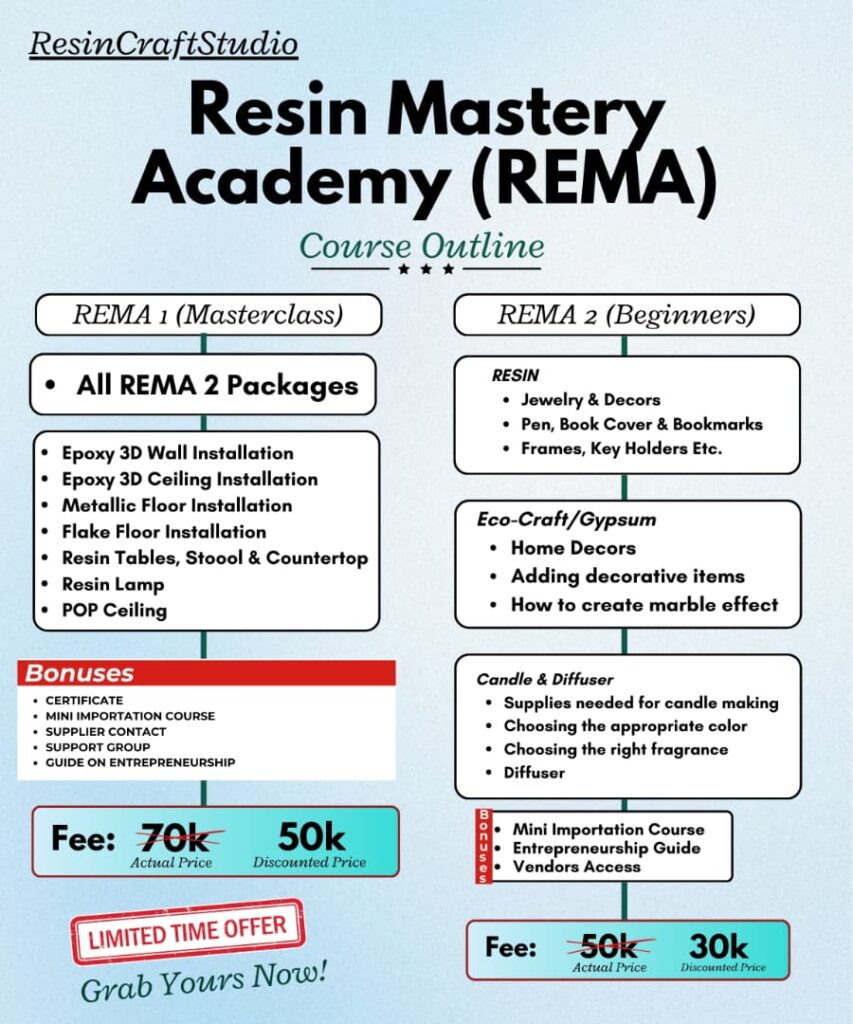 But you might be wondering, what is this ‘REMA’ Course? “REMA” Course is an abbreviation for “Resin Art & Craft Upgraded” course.